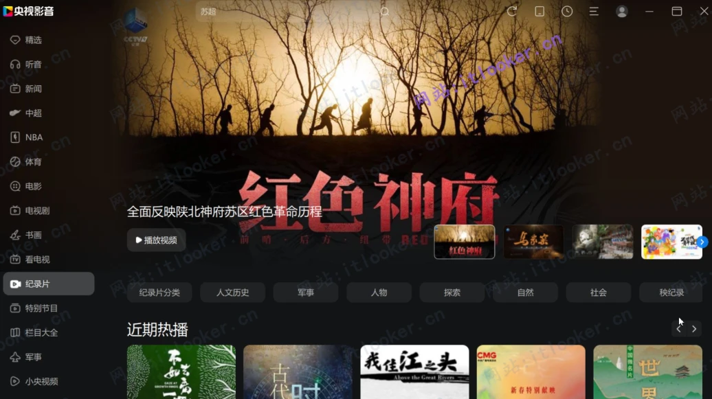 纪录片分类:以“纪录片”频道为例,界面中提供了人文历史、军事、人物、探索、自然、社会、秧纪录等多种分类标签。你可以根据自己的兴趣偏好,快速定位到特定类型的纪录片