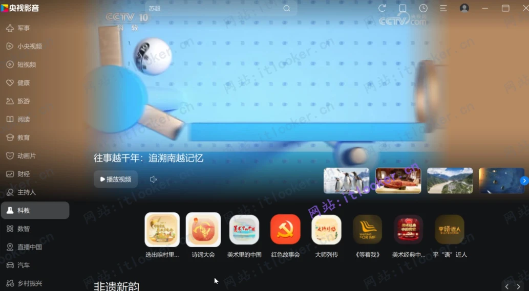 影视资源:在央视影音主界面中,你可以看到涵盖军事、小央视频、短视频、健康、旅游、阅读、教育、动画片、财经、主持人等丰富的频道分类。点击相应频道,即可进入对应的影视资源库