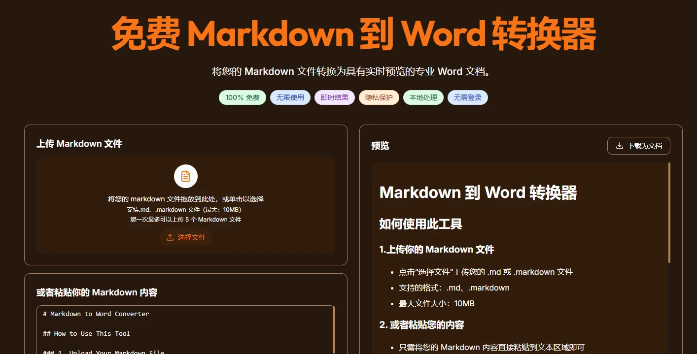 Markdown to Word Converter是一款功能强大的在线工具,可将Markdown文件转换为Word文档,能保留原格式排版,支持实时预览和多种语法