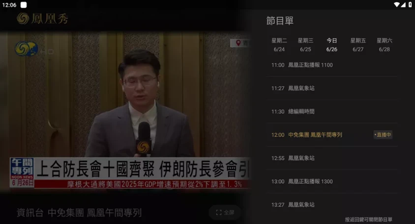 凤凰卫视频道同步直播:提供凤凰卫视中文台、资讯台等多个自有频道的实时直播,直播信号与电视端同步,你打开应用就能看到和电视上相同的内容,包括早间新闻、午间资讯、晚间评论等时段的节目。