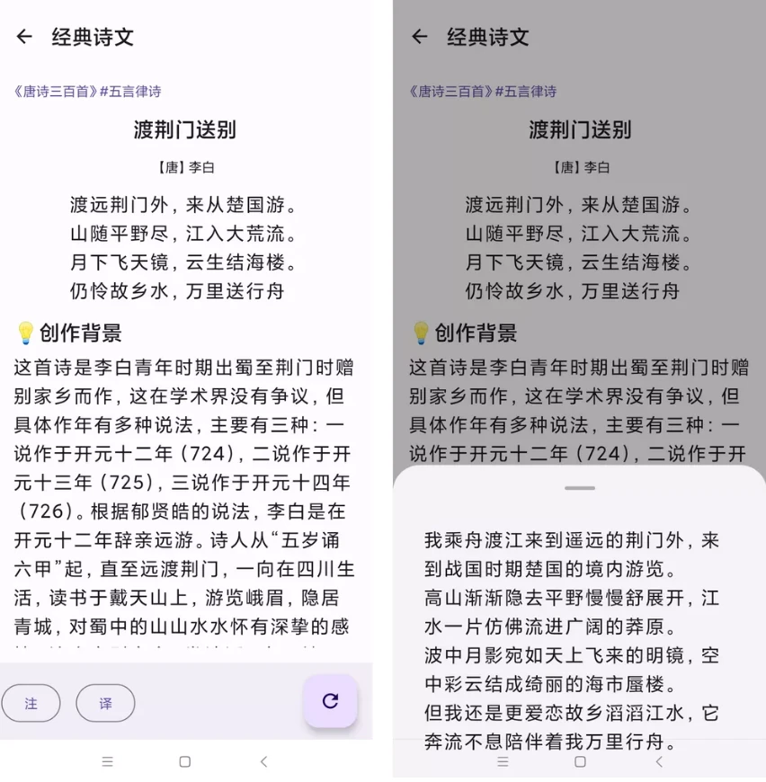 诗词详情解析:每首诗词都附带详细注释和白话译文,部分诗词还包含创作背景、作者生平介绍,帮助你理解诗词中的生僻字词含义,以及作品背后的历史文化语境。