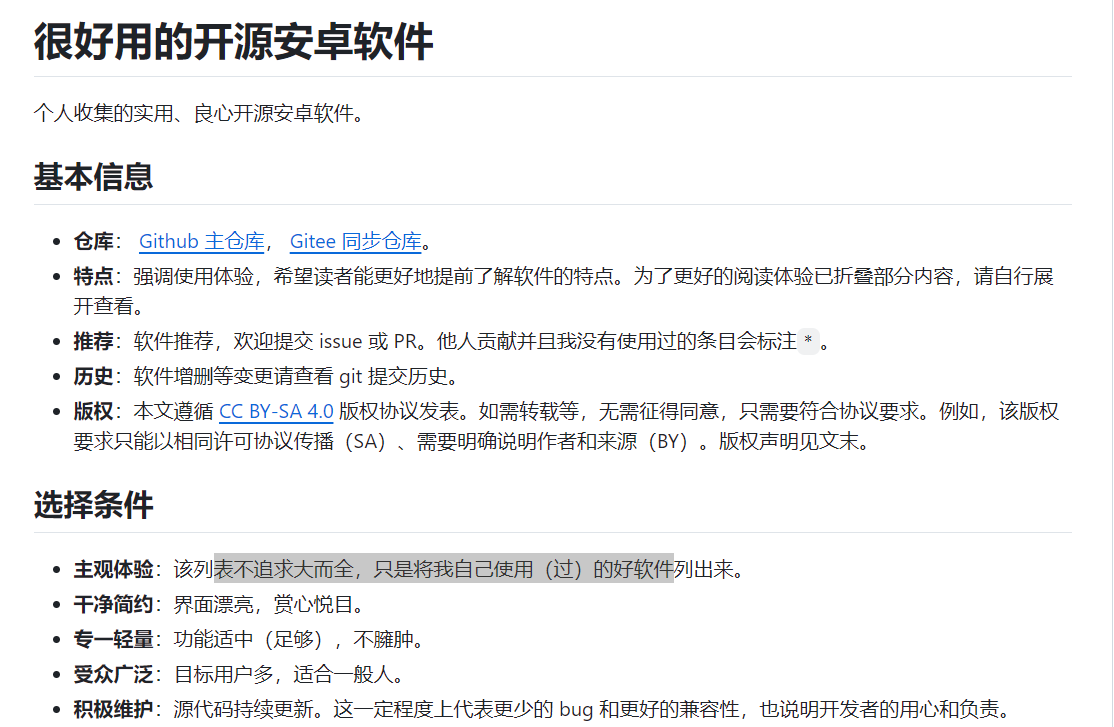 软件信息标注:每个推荐的软件都会标注名称、简介、开源协议类型(如GPL、Apache)、项目仓库链接,部分还会说明是否包含广告、是否需要谷歌服务框架等关键信息,帮助你判断软件是否符合使用场景。