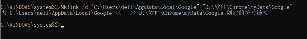mklink /d "C:\Users\dell\AppData\Local\Google" "D:\软件\Chrome\myData\Google"回车后,如果看到提示: