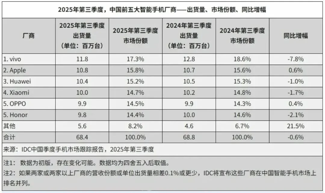 近日,IDC发布2025年第三季度手机销量排行,中国与全球市场均现意外格局。
