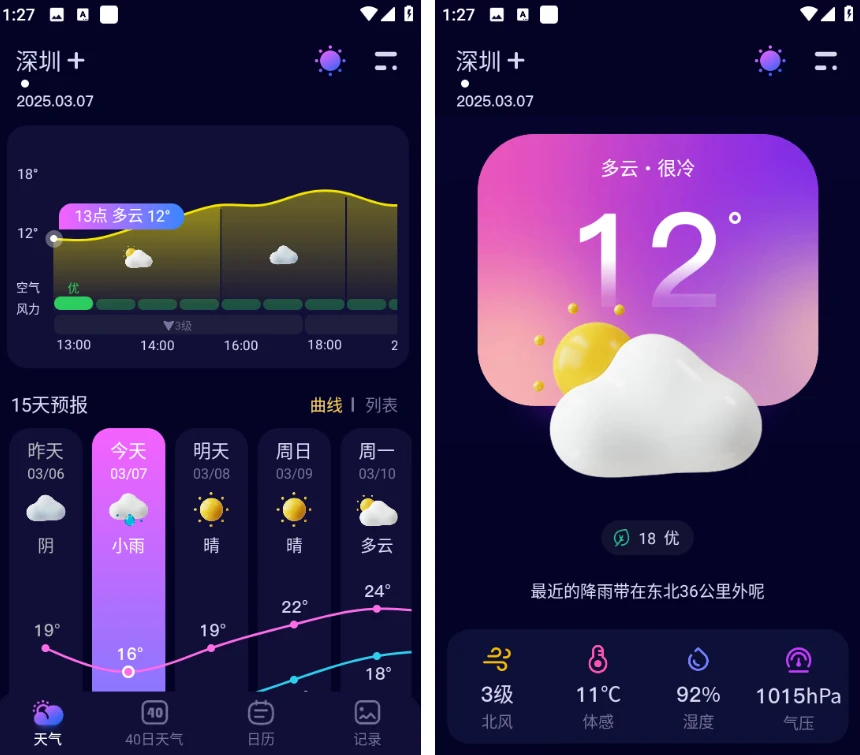 短期精准预测:可提供未来24小时逐小时天气预测,包括每小时气温变化、降水概率、风力等级等信息,比如你早上出门前能知道中午是否会下雨、傍晚是否需要加衣服,方便规划当日行程。