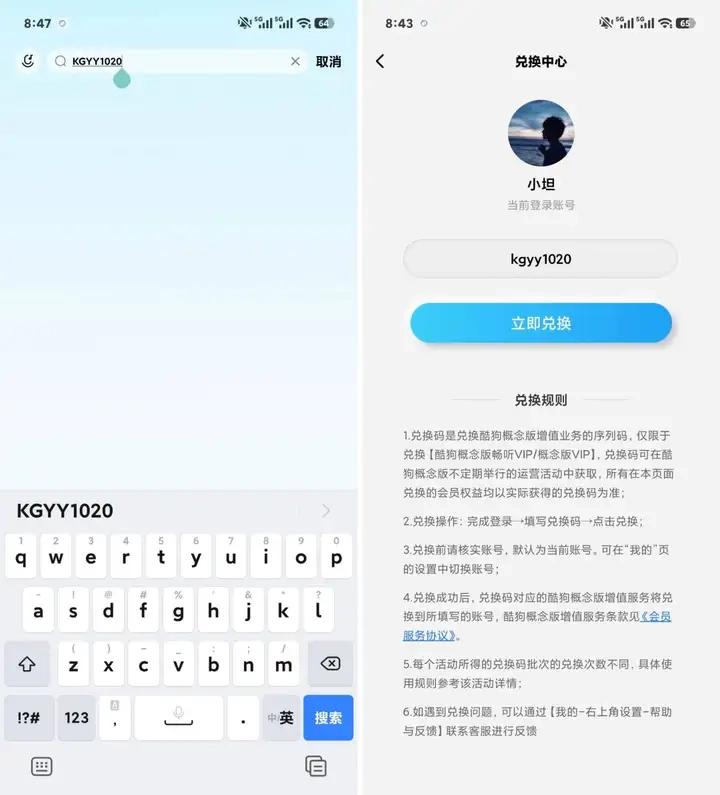 软件虽然也有VIP选项,但是只需要在软件的搜索框中输入兑换码KGYY1020,点击搜索,之后点击立即兑换。就可以兑换100天的VIP听歌权益,实现免费听VIP音乐(软件可以在应用商店下载)