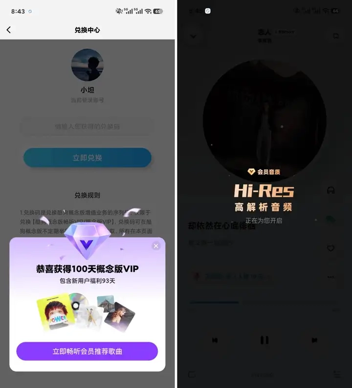 兑换后的会员享受酷狗和QQ音乐中相同的过亿曲库,而且还支持最高Hi-Res的音质