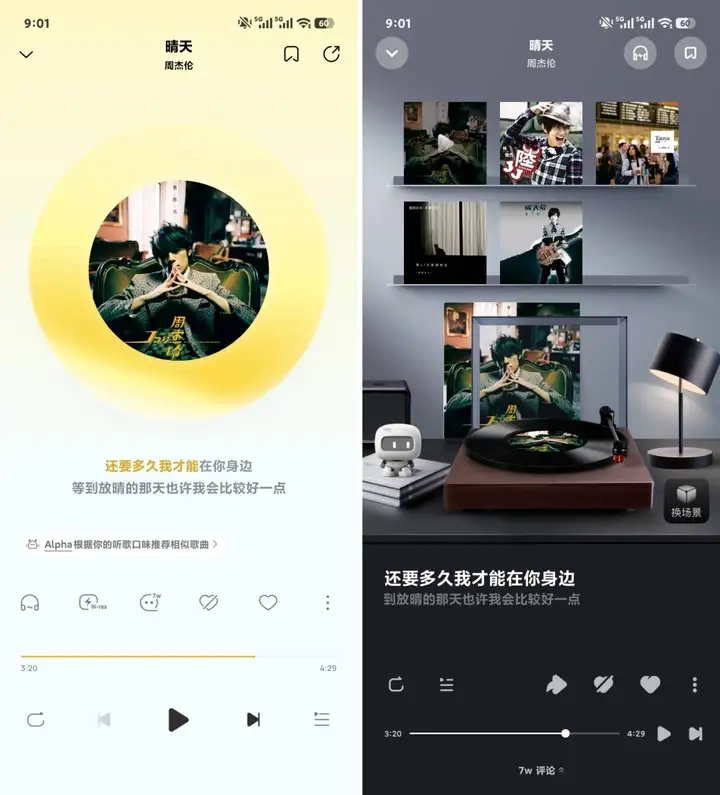 多样化播放页样式:在播放页面,你可以根据自己的审美偏好选择多种不同的样式。应用提供了松弛感十足的「歌词环游」、简约风的「旋转封面」、创意无限的「百变DIY」、文艺清新的「信笺歌词」、沉浸感的「歌手写真」,以及氛围感拉满的「唱片机模式」。