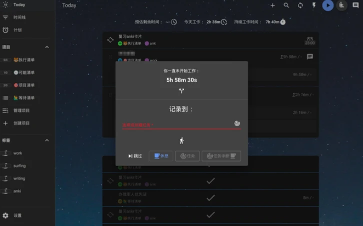 自动时间追踪:开启追踪后,软件会实时记录你在当前任务上的耗时,无需手动计时;如果中途切换到其他任务,也能手动暂停或标记“中断时间”,最终会生成时间统计报表,让你清楚知道“每天2小时花在会议上,3小时在实际执行任务”,方便调整时间分配。