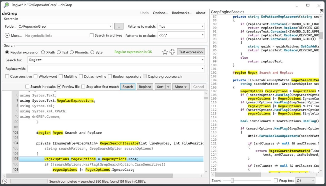 文件预览功能:在搜索结果中,dnGrep能够显示文件的预览,让你在不打开文件的情况下快速查看内容。这对于快速定位信息非常有用,尤其是当文件中关键词出现多次时,dnGrep会把搜索结果聚合起来,展示内容前后一小段的内容。