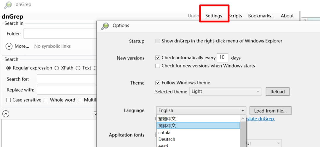 软件支持中文,解压后,双击 dnGREP.exe 即可打开,在 Settings-Options 中可设置语言