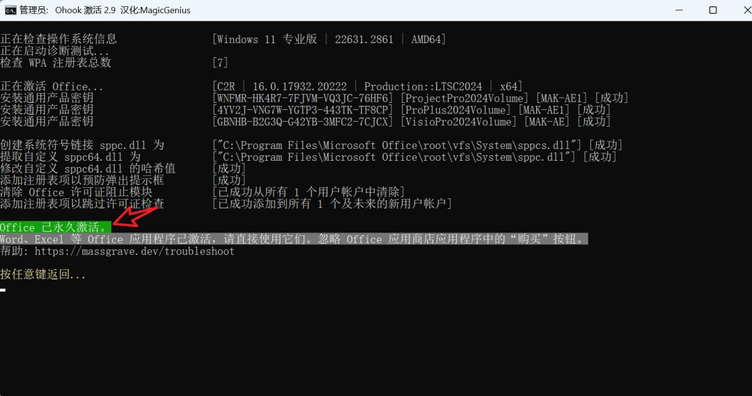 再等待Office鸡和,当显示“Office已永久鸡活”即代表Office鸡和成功。