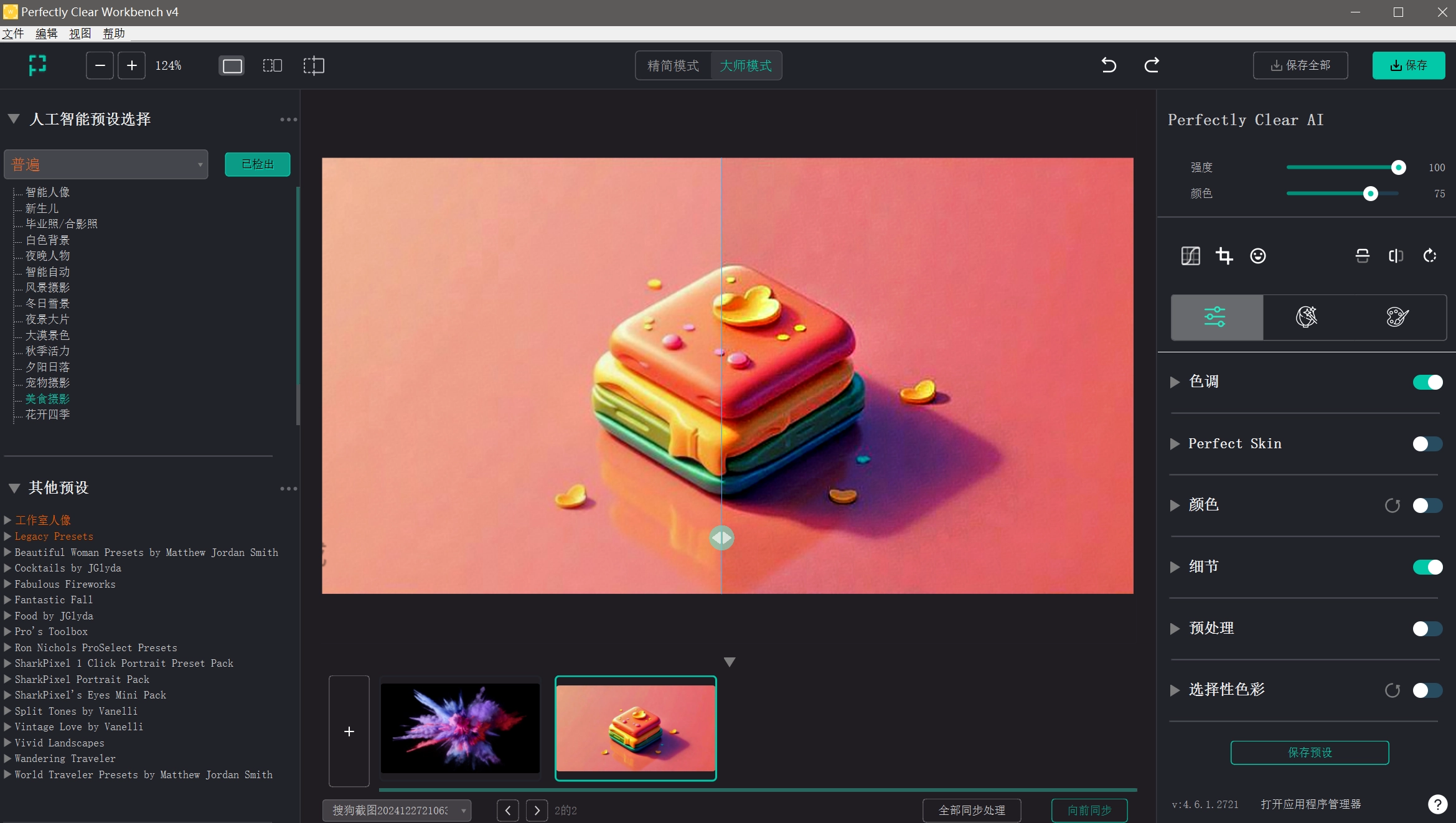 Perfectly Clear WorkBench 是一款专业的图像处理软件,支持 AI 自动校正曝光 / 色彩 / 肤色、批量处理图片、自定义参数及 RAW 格式,适用于摄影、电商、设计场景。有着卓越的图像处理能力。这款软件专注于提供高质量的图像增强功能,能够轻松地提升照片质量。